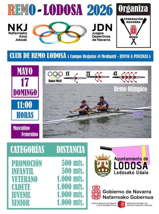 - Calendario Temporada 2026. La próxima cita será el 17 de mayo con la celebración de los Juegos Deportivos de Navarra de remo olímpico en Lodosa. La actividad dará comienzo a las 11.00 horas. Se puede consultar el cartel (2ª imagen adjunta en la noticia) con las categorías y las distancias.